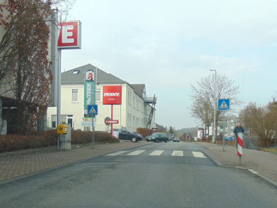 Die Einfahrt ist geprägt durch ein großes "Rewe" Schild.